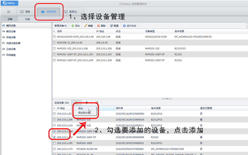 EZStation支持自动搜索所有在线NVR设备,并快速添加。同时支持自动添加NVR设备下的摄像机,如果设备地址遗忘,连接网络,搜索成功后即可直接修改。除此之外,EZStation还能统一管理流媒体服务器、解码器等。